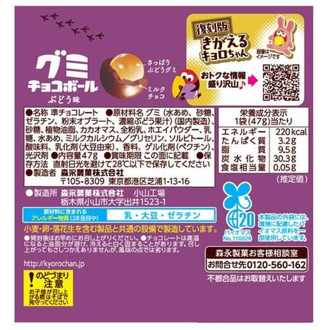 | グミ(水あめ、砂糖、ゼラチン、粉末オブラート、濃縮ぶどう果汁)(国内製造)、砂糖、植物油脂、カカオマス、全粉乳、ホエイパウダー、乳糖、水あめ、ミルクカルシウム/グリセリン、ソルビトール、酸味料、乳化剤(大豆由来)、香料、ゲル化剤(ペクチン)、光沢剤 |