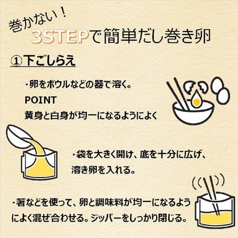 ●卵を入れてレンジでチンするだけで簡単に食べられる、白だし仕立てのだし巻き卵の素です。