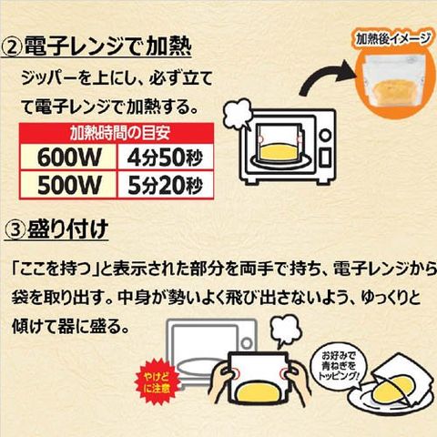 ・加熱後は袋や中身が熱くなっておりますので、やけどにご注意ください。