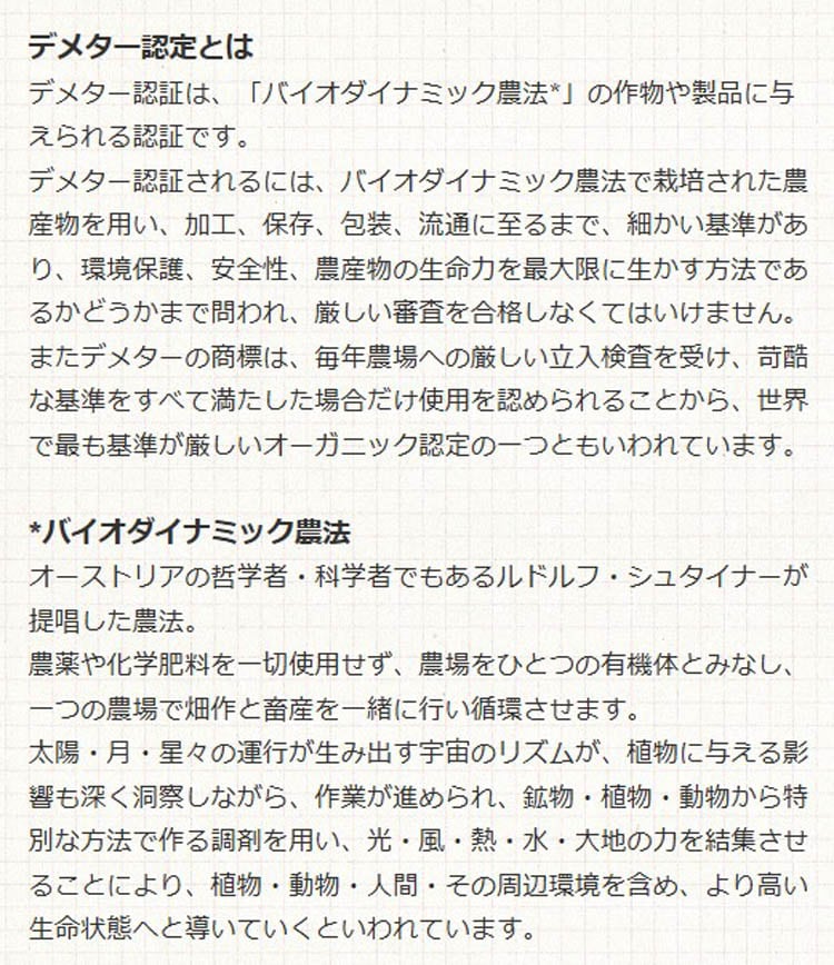 ※デメター認証:バイオダイナミック農法により栽培された農産物を用い、生産・加工・流通に至るまで厳しい基準を満たした農畜産物、その加工品に対し認められる国際的な認証です。