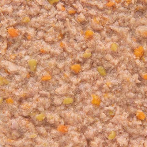 ●鶏胸肉、豚心臓、鶏レバーをベースに、すりおろした野菜(じゃがいも、人参、グリンピース)を加え、シニア犬にも食べやすいやわらかさに仕上げた総合栄養食です。