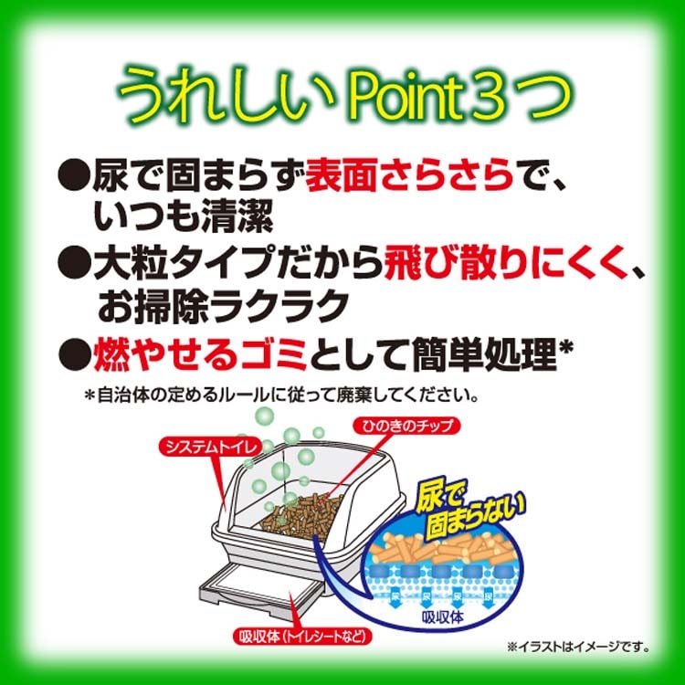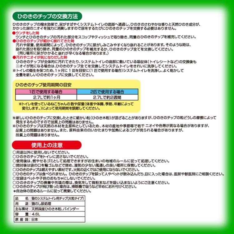 ・汚れや尿量、使用期間によって、ひのきのチップに尿がしみこみやすくなり崩れることがあります。そのような時は、崩れた部分を取り除き、同量のひのきのチップを補充するか、ひのきのチップ全てを交換してください。(同じ場所に尿がかかると崩れが早くなる場合があります。)