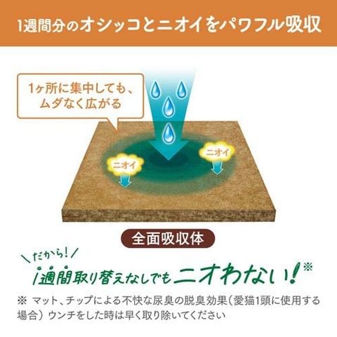 ●パワフル吸収で1週間取り替え不要(※1):厚手のマットが1週間分のオシッコをパワフルに吸収します。(※1)週1回の交換でお手入れラクラク。