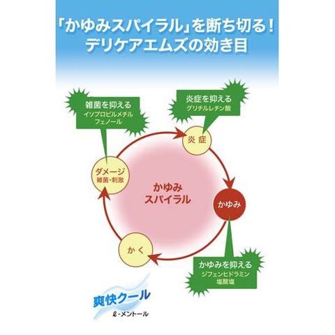 ●デリケアエムズは、デリケートエリアのかゆみを考えて開発された治療薬です。スッキリとしたクール感が、かゆみ感覚をすばやく鎮め、3つの特長(かゆみを止める、炎症を鎮める、雑菌を抑える)で、悪化の要因となるかゆみの悪循環を抑えます。汗やムレの多いデリケートエリアに適したサラッとべたつかないクリームタイプです。