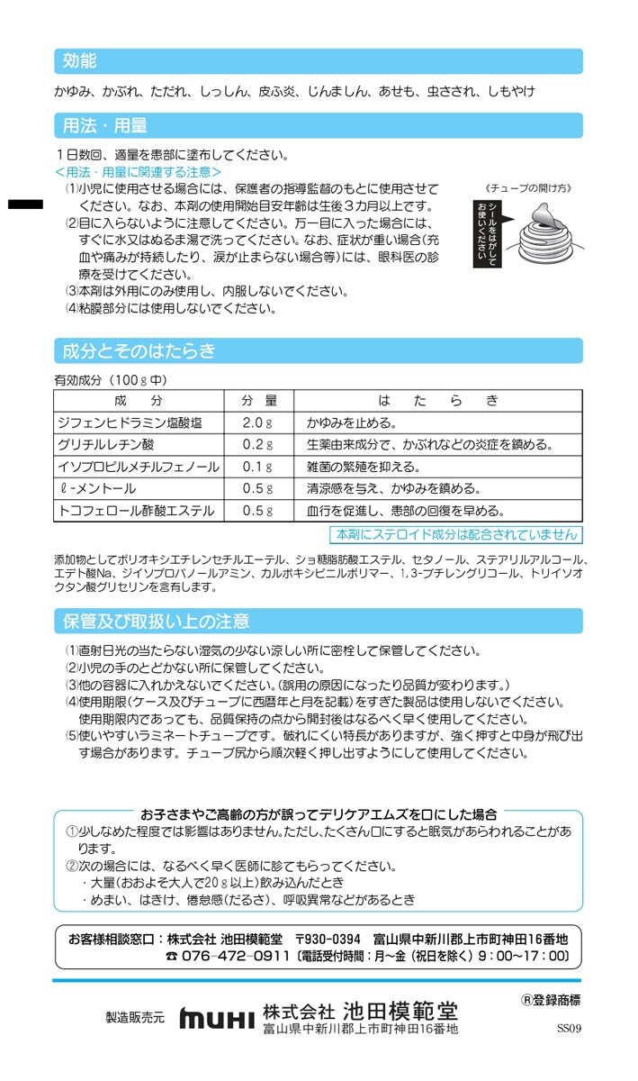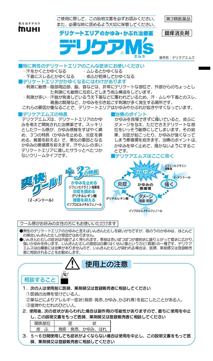 ●デリケアエムズは、デリケートエリアのかゆみを考えて開発された治療薬です。スッキリとしたクール感が、かゆみ感覚をすばやく鎮め、3つの特長(かゆみを止める、炎症を鎮める、雑菌を抑える)で、悪化の要因となるかゆみの悪循環を抑えます。汗やムレの多いデリケートエリアに適したサラッとべたつかないクリームタイプです。