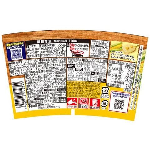 | 乳糖(アメリカ製造)、コーンパウダー、脱脂粉乳、植物油脂、デキストリン、植物性たん白、コラーゲンペプチド、乳等を主要原料とする食品、食物繊維、砂糖、ポテトパウダー、チキン調味料、プロセスチーズ、ドロマイト、たん白加水分解物、食塩、酵母、納豆菌エキス入り食用油脂、うきみ・具(コーン、パセリ)/増粘剤(加工でん粉、グァーガム)、調味料(アミノ酸等)、加工でん粉、香料、塩化K、乳化剤、リン酸塩(Na)、香辛料抽出物、V.C、ナイアシン、V.B6、ピロリン酸鉄、V.E、パントテン酸Ca、V.B1、V.A、V.B2、葉酸、V.D、V.B12、(一部に乳成分・大豆・鶏肉・ゼラチンを含む) |