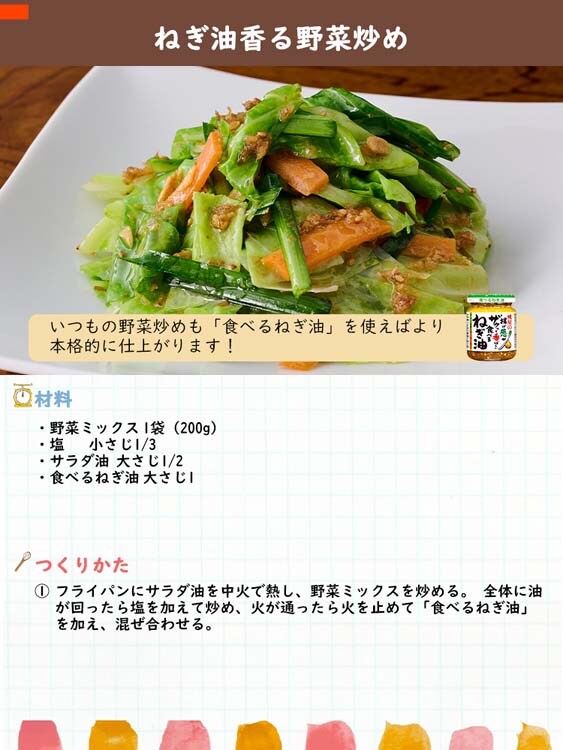 | なたね油(国内製造)、揚げねぎ、ねぎ油(大豆油、ねぎ)、フライドオニオン、フライドガーリック、いりごま、砂糖、食塩、ごま油、焦がしねぎペースト、オニオンパウダー、白こしょう/調味料(アミノ酸)、酸化防止剤(V.E) |