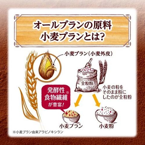 ●本品には小麦ブラン由来アラビノキシランが含まれます。小麦ブラン由来アラビノキシランは、発酵性の食物繊維で、善玉菌とよばれる腸内の酪酸菌を増やし、酪酸を増加させることにより、腸内環境を改善することが報告されています。また、小麦ブラン由来アラビノキシランはお腹の調子を整え便通を改善することが報告されています。