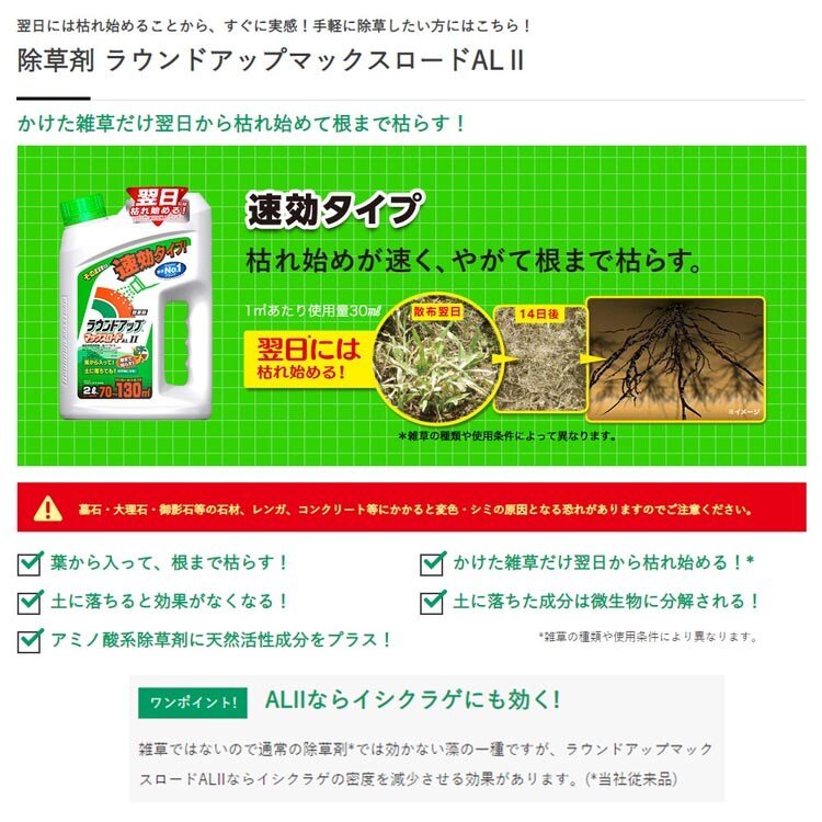 ●葉にかけるだけで根まで枯らす力はそのままに、翌日から枯れ始める速効性をプラス。あなたを草むしりの重労働から解放します。