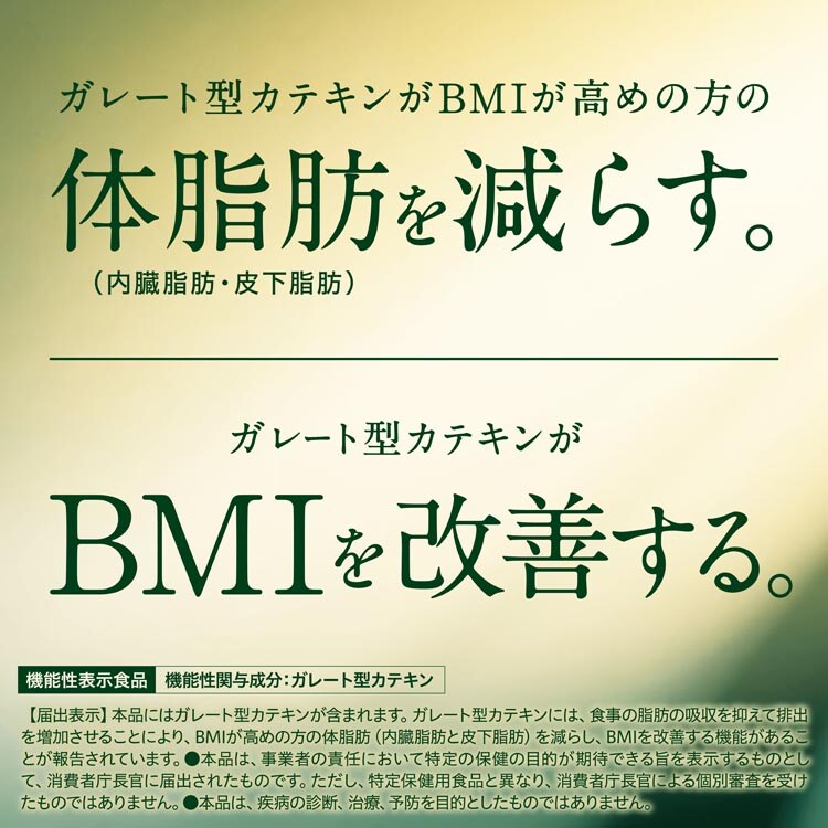 本品にはガレート型カテキンが含まれます。ガレート型カテキンには、食事の脂肪の吸収を抑えて排出を増加させることにより、BMIが高めの方の体脂肪(内臓脂肪と皮下脂肪)を減らし、BMIを改善する機能があることが報告されています。