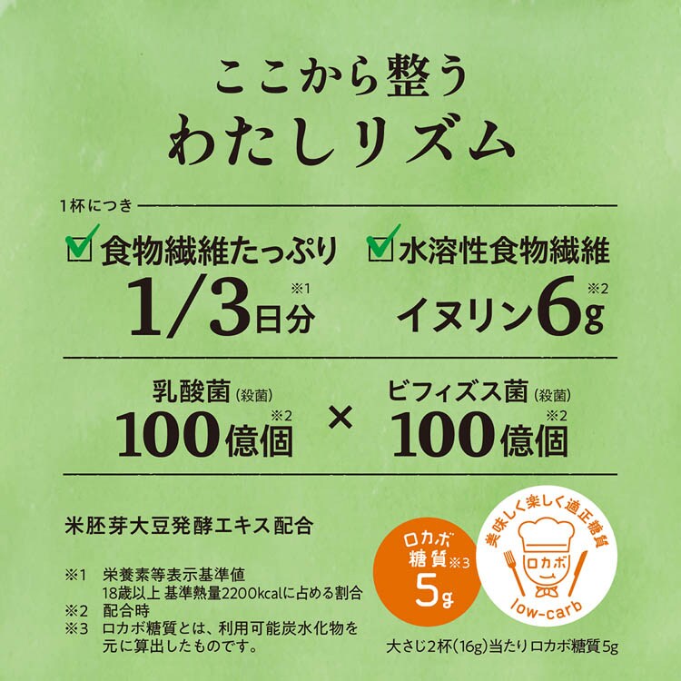 | 一日の摂取目安量16g当たり 熱量:35.7kcal、たんぱく質:0.11g、脂質:0.10g、炭水化物:15.2g、 糖質:7.8g、 食物繊維:7.3g、食塩相当量:0.02g イヌリン※配合時:6g、乳酸菌(殺菌)※配合時:100億個、ビフィズス金(殺菌):100億個 |