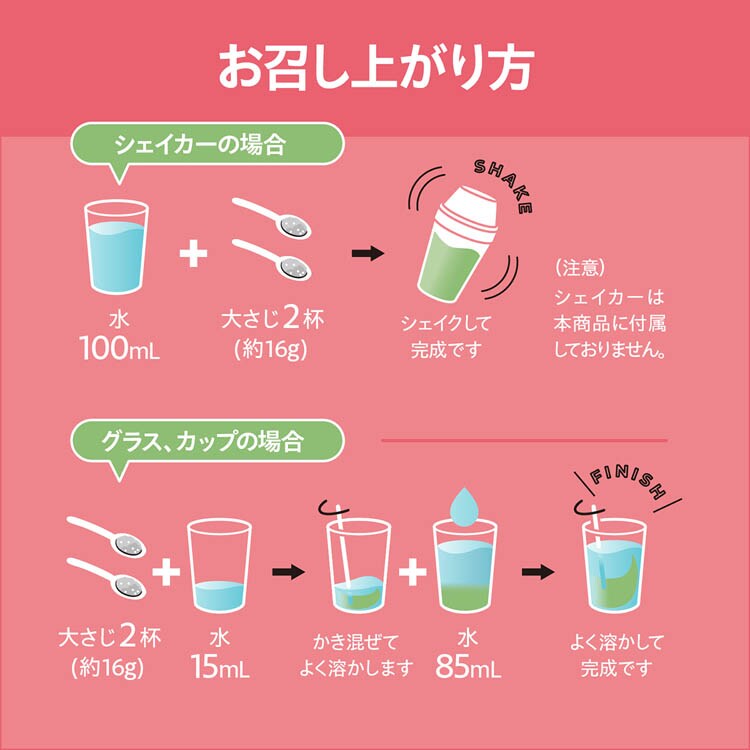 シェイカーの場合:水100ml + 大さじ2杯(約16g) → シェイクして完成です。(注意)シェイカーは本商品に付属しておりません。