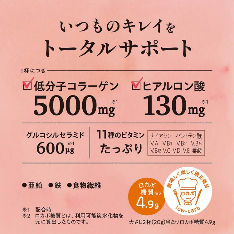 | 一日の摂取目安量20g当たり 熱量:51.0kcal、たんぱく質:5.5g、脂質:0.1g、炭水化物:13.5g、糖質:9.1g、食物繊維:4.4g、食塩相当量:0.04g、亜鉛:3.2mg、鉄:2.3mg、ナイアシン:5.4mg、パントテン酸:2.1mg、ビタミンA:262μg、ビタミンB1:0.4mg、ビタミンB2:0.5mg、ビタミンB6:0.5mg、ビタミンB12:1.1μg、ビタミンC:62.6mg、ビタミンD:1.8μg、ビタミンE:2.2mg、葉酸:9.4μg 魚由来コラーゲンペプチド※配合時:5000mg、ヒアルロン酸※配合時:130mg、モモ由来グルコシルセラミド※配合時:600μg |