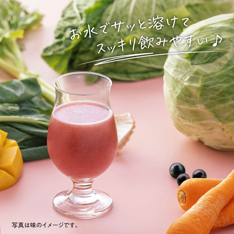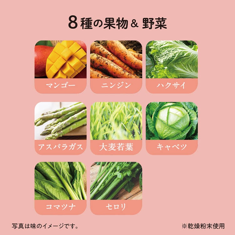 | コラーゲンペプチド(国内製造)、エリスリトール、イヌリン、マンゴーパウダー(マンゴー、デキストリン)、野菜ミックス粉末、セラミド含有桃抽出物/増粘剤(加工デンプン、増粘多糖類)、環状オリゴ糖、酸味料、着色料(クチナシ)、ヒアルロン酸、微粒二酸化ケイ素、V.C、甘味料(ラカンカ抽出物)、グルコン酸亜鉛、香料、ピロリン酸第二鉄、抽出V.E、ナイアシン、パントテン酸Ca、V.B1、V.B6、V.B2、V.A、葉酸、V.D、V.B12、(一部にゼラチン、ももを含む) |