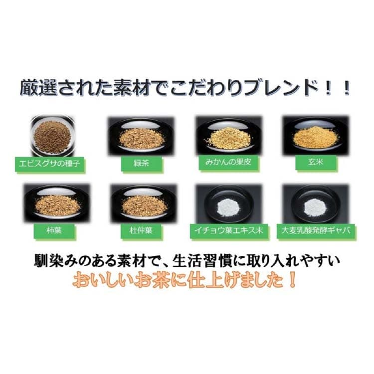 | エビスグサの種子(インド)、緑茶、みかんの果皮、玄米、柿葉、杜仲葉、イチョウ葉エキス末、大麦乳酸発酵GABA |