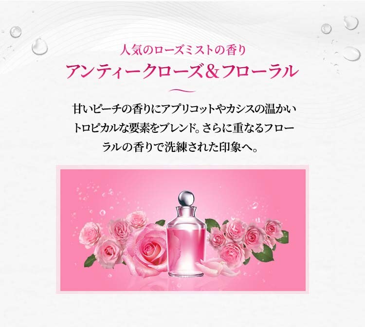 ●アンティークローズ&フローラルの香り:上品なフローラルの中に、甘いピーチとアプリコットの温かさをブレンド。