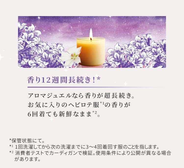 ※1メーカー柔軟剤比。複数回洗濯後。※2アロマジュエル通常サイズ(420mL)1週間に2回、3kgの洗濯(本品36mL使用で)
