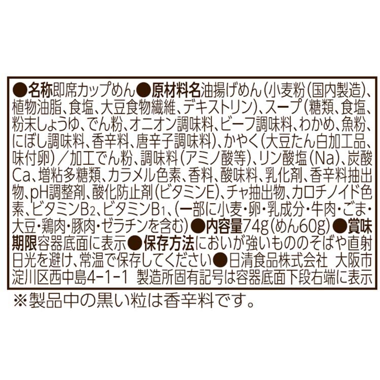 | 油揚げめん(小麦粉(国内製造)、植物油脂、食塩、大豆食物繊維、デキストリン)、スープ(糖類、食塩、粉末しょうゆ、でん粉、オニオン調味料、ビーフ調味料、わかめ、魚粉、にぼし調味料、香辛料、唐辛子調味料)、かやく(大豆たん白加工品、味付卵)/加工でん粉、調味料(アミノ酸等)、リン酸塩(Na)、炭酸Ca、増粘多糖類、カラメル色素、香料、酸味料、乳化剤、香辛料抽出物、pH調整剤、酸化防止剤(ビタミンE)、チャ抽出物、カロチノイド色素、ビタミンB2、ビタミンB1、(一部に小麦・卵・乳成分・牛肉・ごま・大豆・鶏肉・豚肉・ゼラチンを含む) |