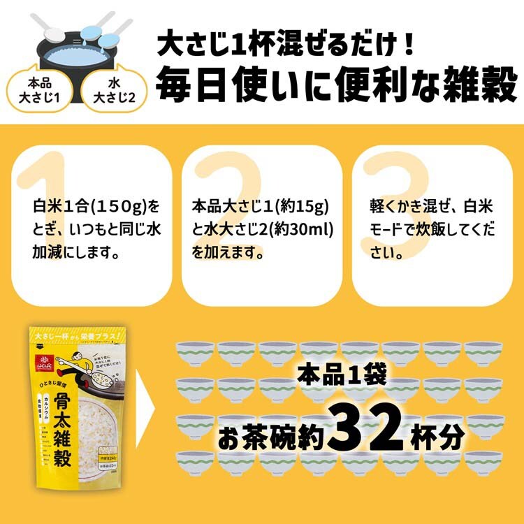 | もち麦(もち大麦(アメリカ又はカナダ))、強化精麦、米粒麦、うるちひえ、アマランサス、もち米、挽割はと麦、発芽玄米、キヌア/貝カルシウム、乳酸カルシウム、グルコン酸カルシウム、ナイアシン、糊料(アラビアガム)、ビタミンB6、ビタミンB1、ビタミンD |