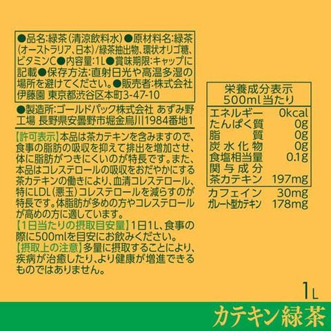 | 500ml当たり エネルギー:0kcal、たんぱく質:0g、脂質:0g、炭水化物:0g、食塩相当量:0.1g 関与成分 茶カテキン:197mg カフェイン:30mg、ガレート型カテキン:178mg |
