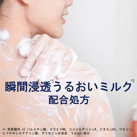 ●point4バランス洗浄処方で肌を保水しながら汚れを洗い流します。瞬間浸透※2 うるおいミルク※3、トリプルセラミド※4 配合 だから、お風呂上りもうるおい続く。