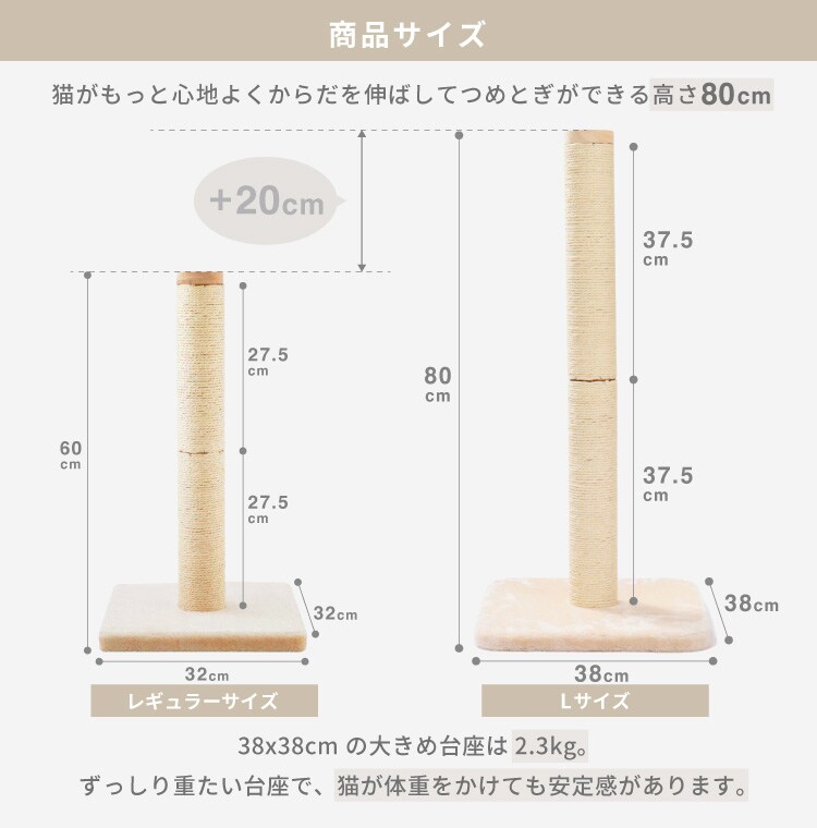 高さ80cmのLサイズは、レギュラーサイズよりももっとからだを伸ばしてつめとぎができるサイズ。