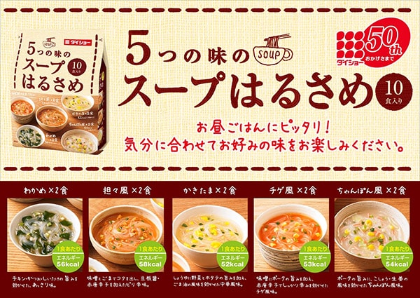 | 具入り粉末スープ 【わかめ】乳成分・小麦・さば・大豆・鶏肉・ごま 【担々風】卵・乳成分・小麦・大豆・鶏肉・豚肉・ゼラチン・ごま 【かきたま】卵・乳成分・小麦・かに・大豆・ゼラチン・ごま 【チゲ風】小麦・大豆・鶏肉・豚肉・ごま 【ちゃんぽん風】卵・乳成分・小麦・かに・大豆・豚肉・ゼラチン・ごま |