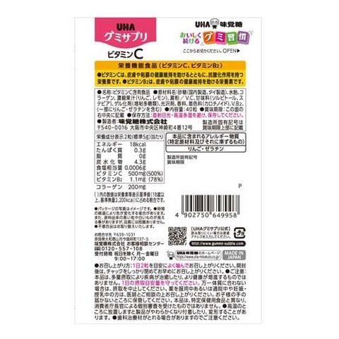 砂糖(国内製造、タイ製造)、水飴、コラーゲン、濃縮果汁(りんご、レモン)、澱粉/V.C、甘味料(ソルビトール、ステビア)、ゲル化剤(増粘多糖類)、光沢剤、香料、着色料(カロチノイド)、V.B2、(一部にりんご・ゼラチンを含む)