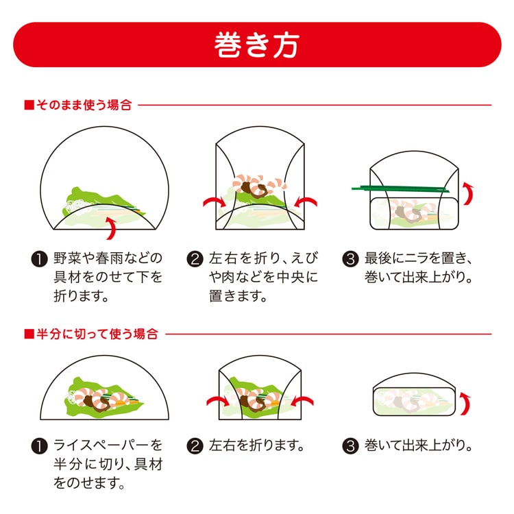 ●野菜やエビなどを巻いて食べる定番の生春巻きをはじめ、そのまま生で使用するだけでなく、焼く・揚げる・蒸す、その他スイーツにするなど、幅広いアレンジレシピが可能です。