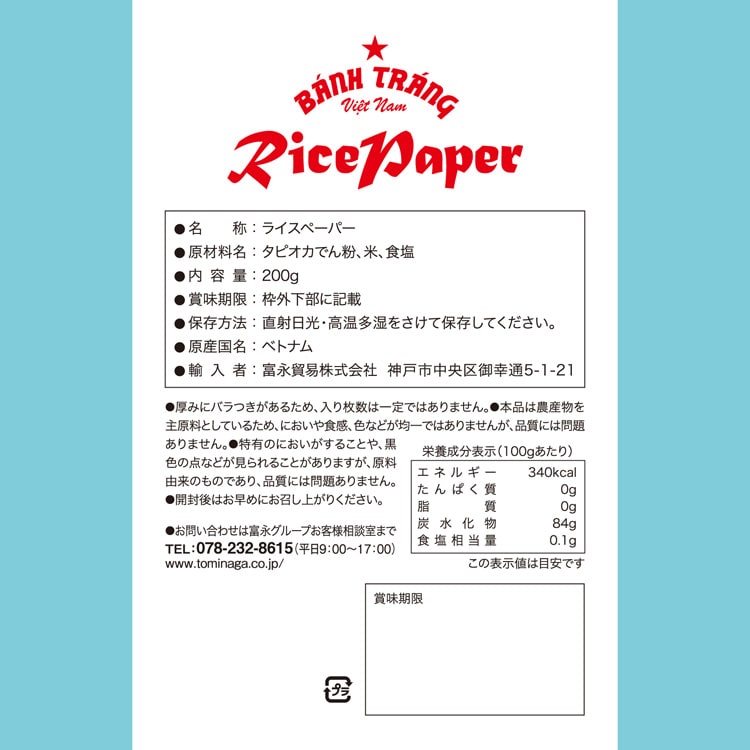 ●ライスペーパーとは、米粉とタピオカでんぷんを原料とし、水と塩だけを加えて薄いシート状にしてから乾燥させたベトナムの食材です。
