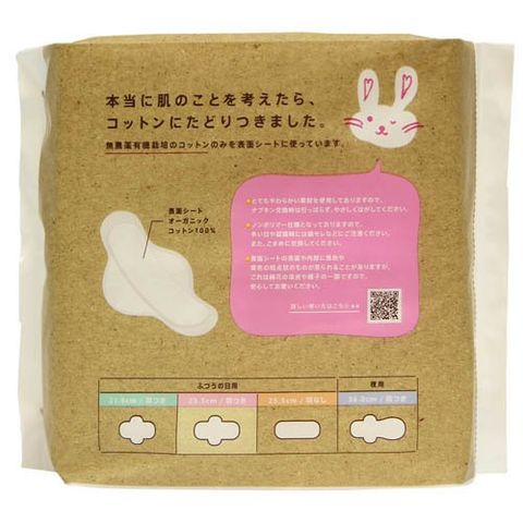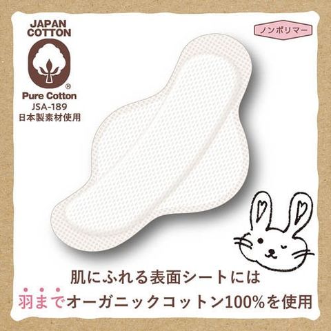| 表面シート:コットン(オーガニックコットン100%) 色調:ホワイト ※本品の表面シートは漂白処理を行っておりますが、身体と環境にやさしい過酸化水素漂白を採用しています。 長さ:25.5cm |
