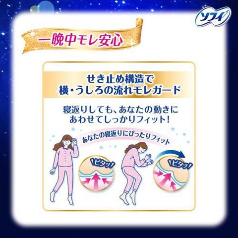 ●せき止め構造で横・うしろの流れモレをガードし、寝返りモレ0へ。多い日の夜でも安心して超熟睡できます。