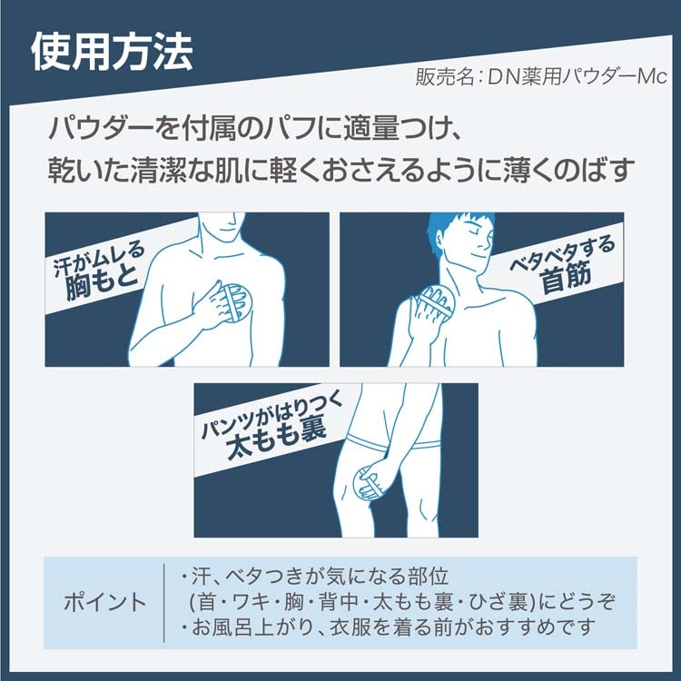 ・汗、ベタつきが気になる部位(首、ワキ、胸、背中、太もも裏、ヒザ裏、足の裏など)にお使いいただくのが効果的です。