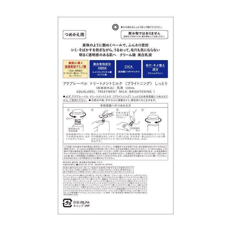 ・トリートメントミルク (ブライトニング) しっとり (つめかえ用)は、必ず、アクアレーベル トリートメントミルク (ブライトニング) しっとり の本体容器につめかえてから、ご使用ください。