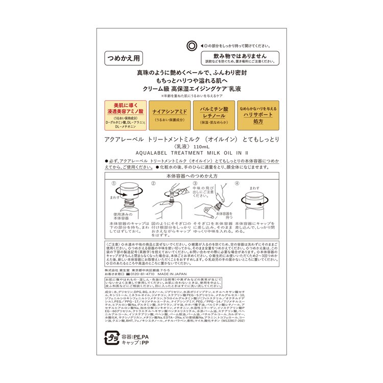 ・トリートメントミルク (オイルイン) しっとり (つめかえ用)は、必ず、アクアレーベル トリートメントミルク (オイルイン) しっとり の本体容器につめかえてから、ご使用ください。