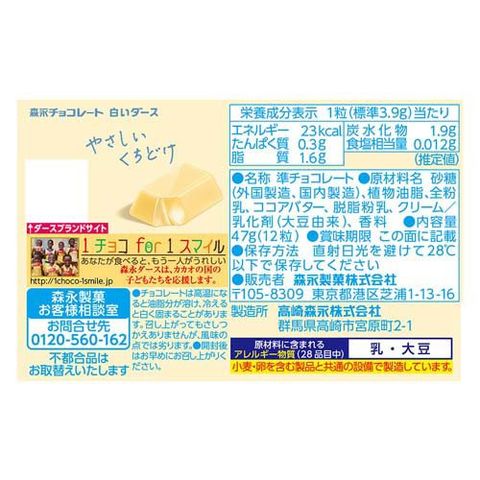 砂糖(外国製造、国内製造)、全粉乳、ココアバター、植物油脂、脱脂粉乳/乳化剤(大豆由来)、香料