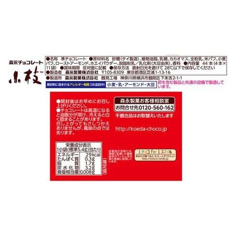 | 砂糖、植物油脂、カカオマス、乳糖、全粉乳、コーンフレーク、シュガーコートアーモンド、米パフ、ホエイパウダー、脱脂粉乳、アーモンド、果糖、乳化剤(大豆由来)、香料、(原材料の一部に小麦を含む) |
