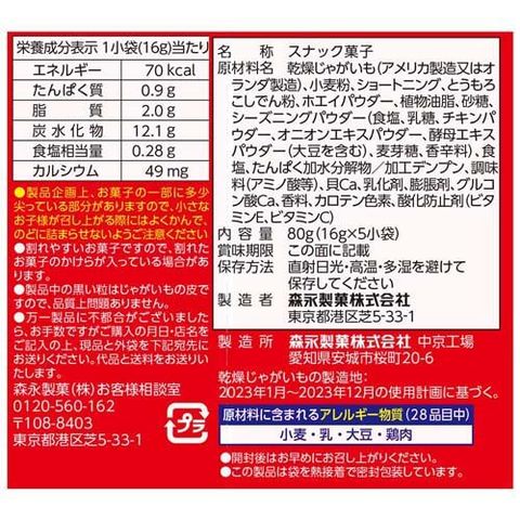 | 1小袋(16g)当たり エネルギー:70kcal、たんぱく質:0.9g、脂質:2.0g、炭水化物:12.1g、食塩相当量:0.28g(推定値)カルシウム:49mg |