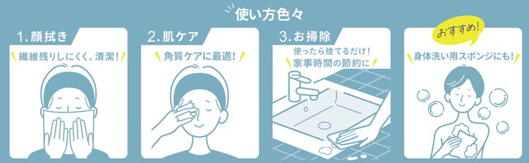 ・肌ケア:メイクリムーバーや拭き取り用化粧水を含ませてクレンジング、または毛穴、角質ケアに使用してください石けんで泡立てたら、身体洗い用スポンジとして使えます