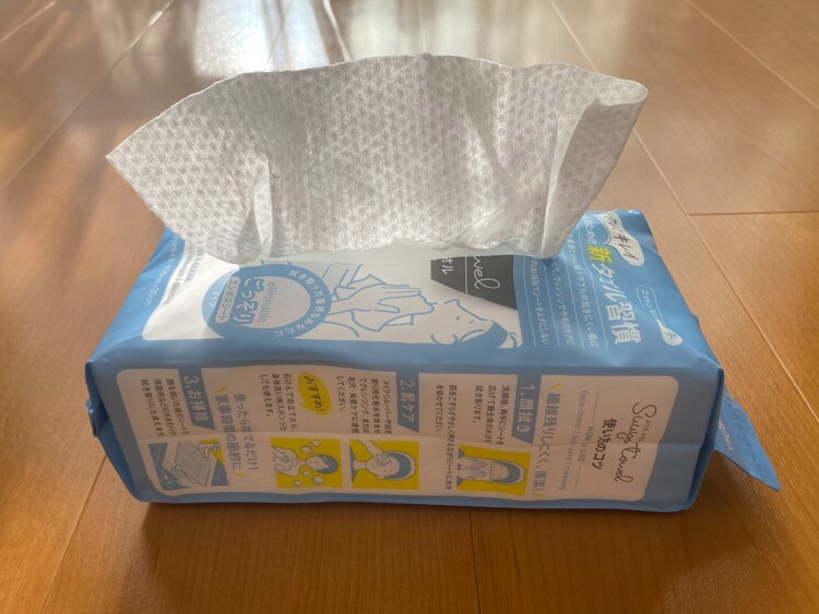 ・顔拭き:洗顔後、両手にシートを広げて顔全体の水分を拭き取ります肌をこすらずやさしく押さえながらシートに水分を吸わせてください