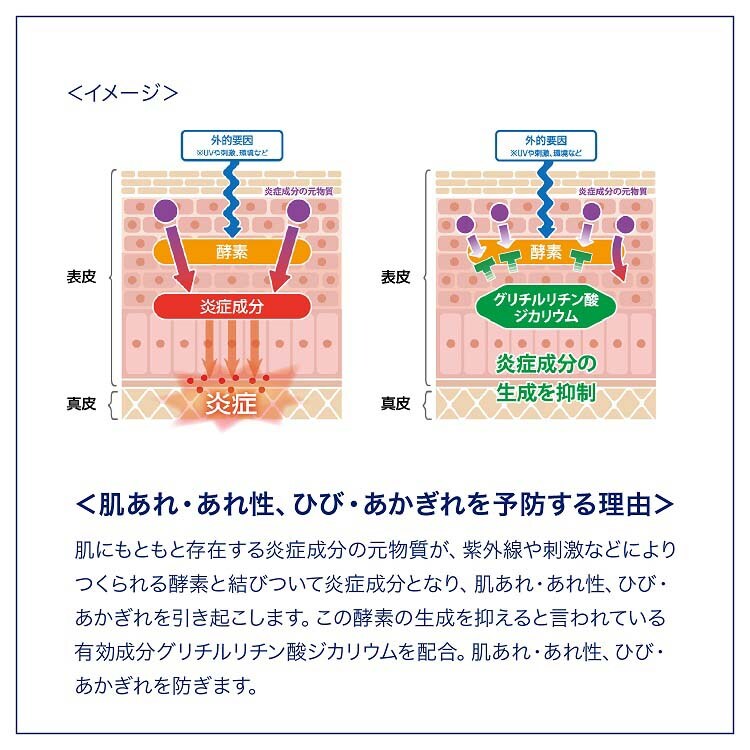| 有効成分:グリチルリチン酸2K その他の成分:白色ワセリン、濃グリセリン、ステアリン酸、パルミチン酸イソプロピル、ステアリン酸グリコール、ステアリン酸PEG、流動パラフィン、ジメチコン、親油型ステアリン酸グリセリル、セタノール、アクリル酸・メタクリル酸アルキル共重合体、加水分解ヒアルロン酸、アセチル化ヒアルロン酸ナトリウム、ヒアルロン酸Na-2、N-ステアロイルジヒドロスフィンゴシン、ステアロイルフィトスフィンゴシン、ヒドロキシステアリルフィトスフィンゴシン、イソステアリン酸フィトステリル、べヘニルアルコール、ペンタステアリン酸デカグリセリル、ステアロイル乳酸Na、TEA、EDTA-2Na、フェノキシエタノール、メチルパラベン、プロピルパラベン |