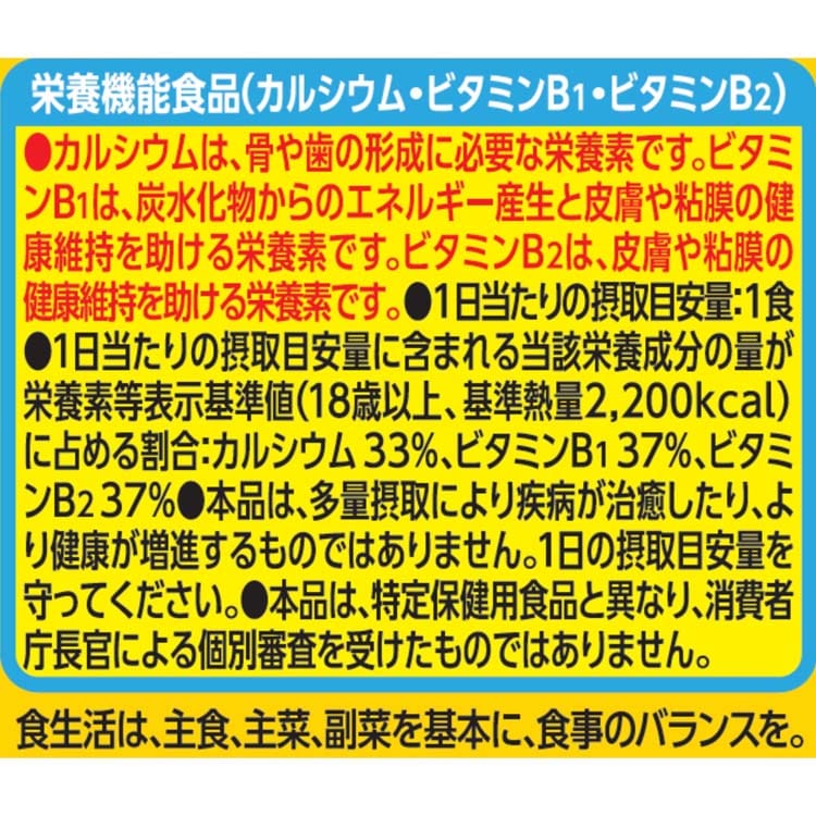 1日当たりの摂取目安量に含まれる当該栄養成分の量が栄養素等表示基準値(18歳以上、基準熱量2200kcal)に占める割合:カルシウム:33%、ビタミンB1:37%、ビタミンB2:37%