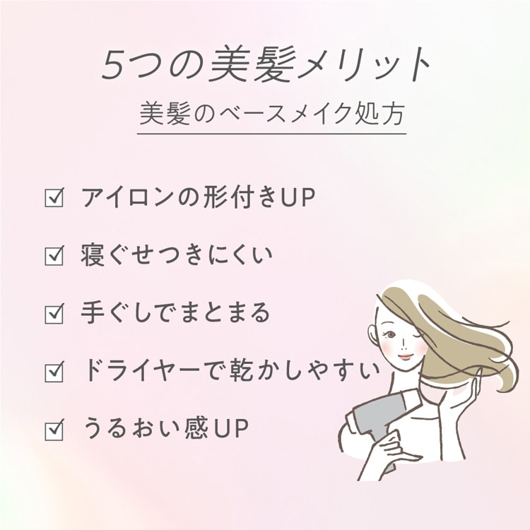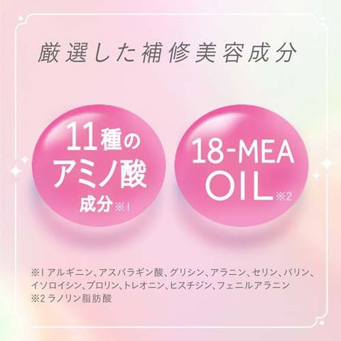 アルギニン、アスパラギン酸、グリシン、アラニン、セリン、バリン、イソロイシン、プロリン、トレオニン、ヒスチジン、フェニルアラニン+天然由来の美髪オイル18-MEA OIL※1配合(毛髪保護)