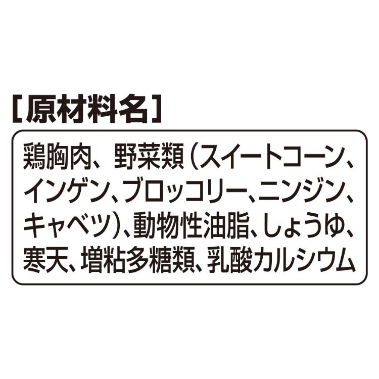 | 鶏胸肉、野菜類(スイートコーン、インゲン、ブロッコリー、ニンジン、キャベツ)、動物性油脂、しょうゆ、寒天、増粘多糖類、乳酸カルシウム |