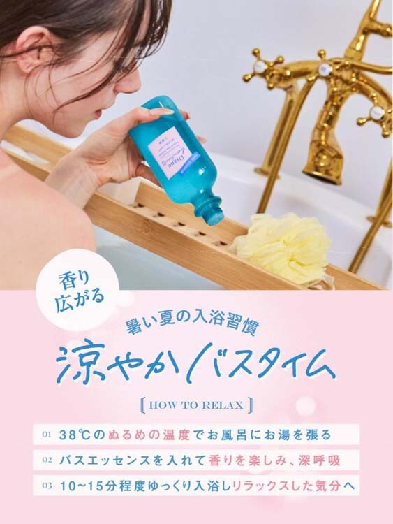 ●オーガニックエキス配合でサラッとすべすべ肌に。クールタイプのバスエッセンス。ピーチティーソルベの香り。