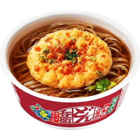 | 油揚げめん(小麦粉(国内製造)、そば粉、植物油脂、食塩、植物性たん白、しょうゆ、デキストリン、かつおぶし粉末、糖類)、かやく(天ぷら)、スープ(糖類、食塩、かつおぶし調味料、粉末しょうゆ、魚粉、ねぎ、オニオン調味料、七味唐辛子、たん白加水分解物)/加工でん粉、調味料(アミノ酸等)、リン酸塩(Na)、炭酸Ca、カラメル色素、香料、酸味料、酸化防止剤(ビタミンE)、カロチノイド色素、pH調整剤、ベニコウジ色素、ビタミンB2、チャ抽出物、ビタミンB1、(一部にえび・小麦・そば・卵・乳成分・ごま・さば・大豆を含む) |