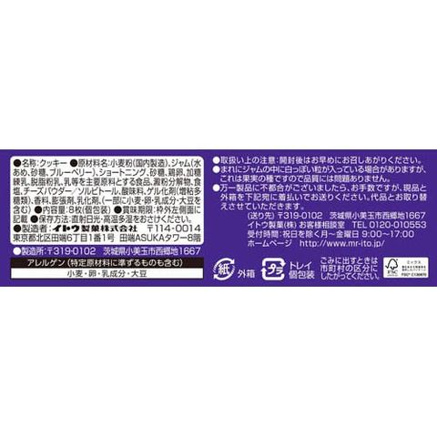 | 小麦粉(国内製造)、ジャム(水あめ、砂糖、ブルーベリー)、ショートニング、砂糖、鶏卵、加糖練乳、脱脂粉乳、乳等を主要原料とする食品、澱粉分解物、食塩、チーズパウダー/ソルビトール、酸味料、ゲル化剤(増粘多糖類)、香料、膨張剤、乳化剤、(一部に小麦・卵・乳成分・大豆を含む) |