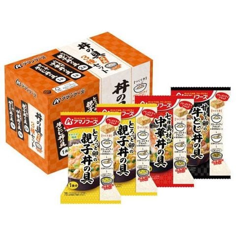 | とろっと卵の親子丼の具(1食/22.5g)×2食、七種具材の中華丼の具(1食/17g)×1食、甘とろ卵の牛とじ丼の具(1食/23.8g)×1食 計3種4食 |