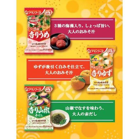 | いつものおみそ汁:香りゆず(1食/9.3g)×2食、香りうめ(1食/6.2g)×2食、香り山椒(1食/9.0g)×1食 計3種5食 |