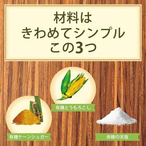 | 有機コーングリッツ(有機とうもろこし)、有機砂糖、食塩(赤穂の天塩) |